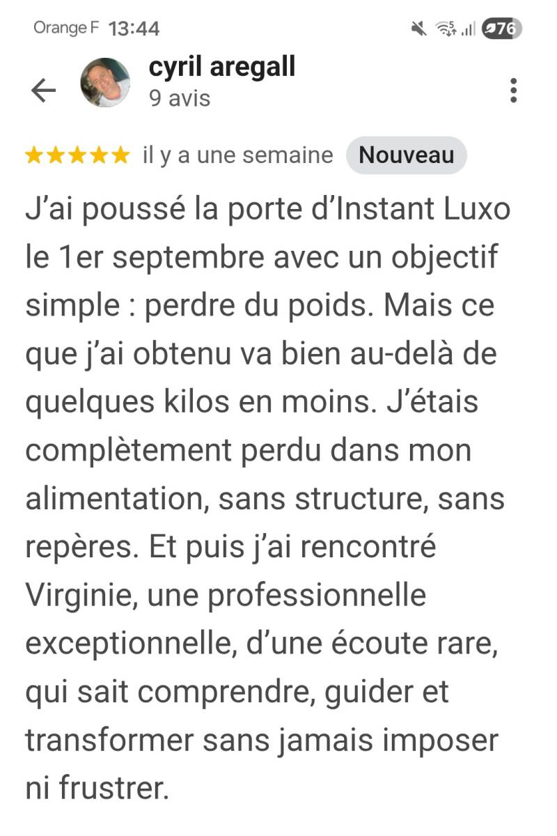 "Virginie est une professionnelle à l'écoute et très compétente. Je recommande vivement INSTANT LUXO pour une expérience de bien-être unique."